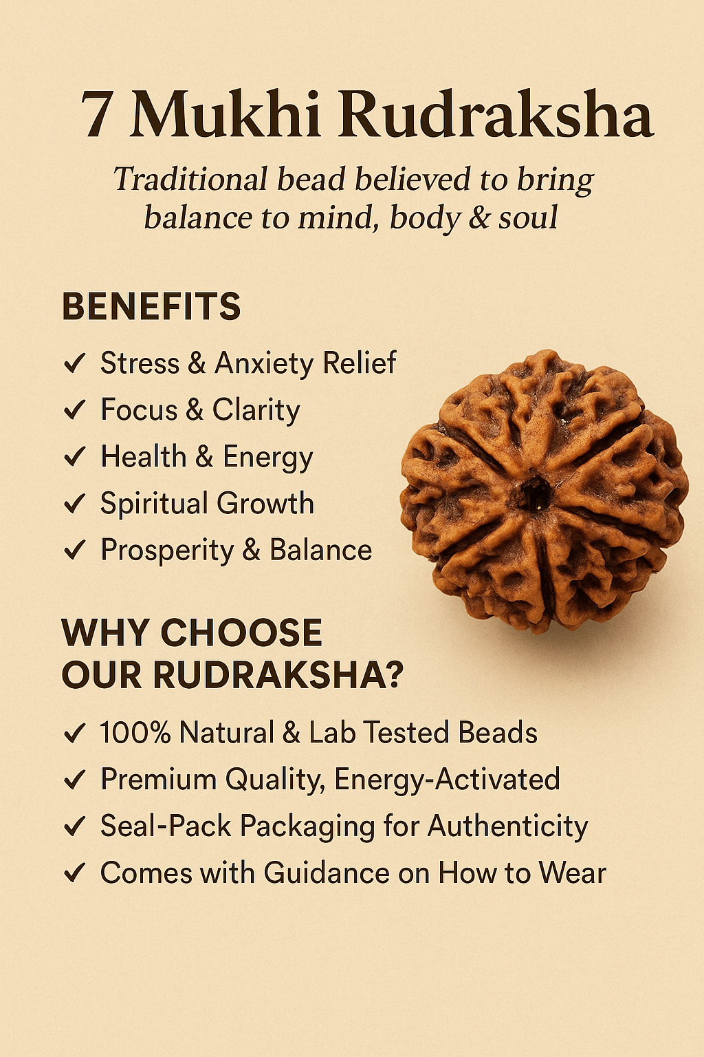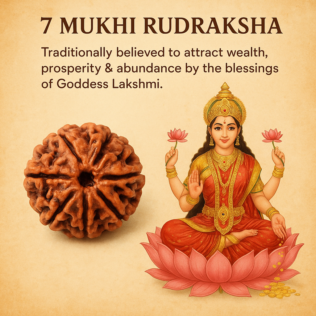 “7 Mukhi Rudraksha – traditionally associated with Goddess Lakshmi, believed to attract wealth, prosperity, and abundance while bringing peace and balance to life.”